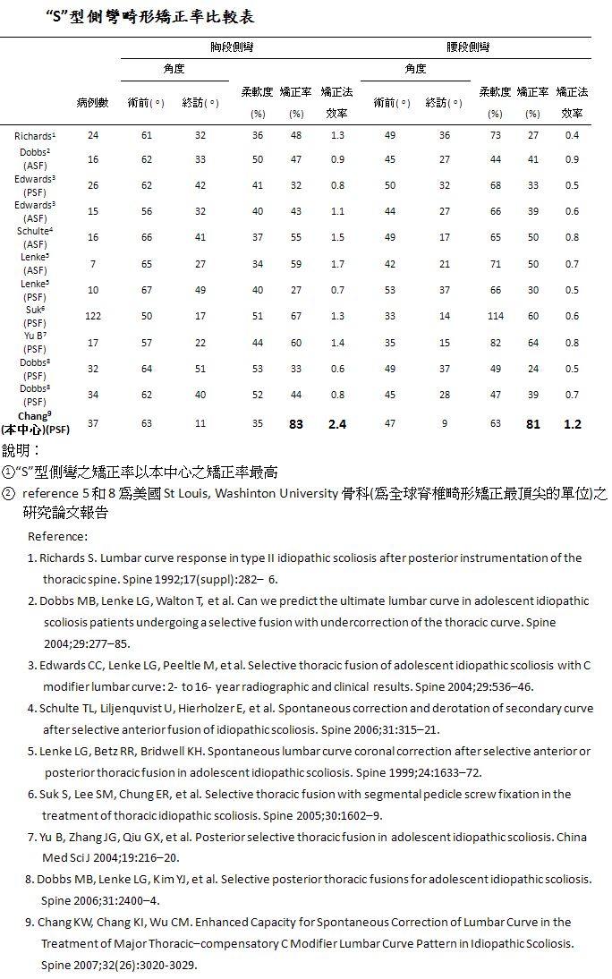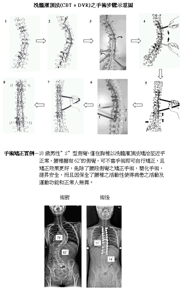 µo©ú¬~ÅèÄé³»ªkªvÀø¡§S¡¨«¬°¼Ås¨Ã©ñ¼e¨ä¨î¡G¡§S¡¨«¬°¼Ås¬°°¼Ås·î§Î¤¤³Ì¦hªº¤@ºØ¡A°ê»Ú¤W³q±`¯Ý¬q°¼Ås¤Î¸y¬q°¼Ås³£¦æ¤â³NÁB¥¿©Î¥HÄYVªº±ø¥ó(curve criteria)¨î¡A¶È¤¹³\¤Ö¼Æ¡§S¡¨«¬°¼Ås¶È§@¯Ý¬q°¼ÅsÁB¥¿¡C¥»¤¤¤ß¸g¦h¦~¤§¬ã¨s©ó2007¦~³Ì¥ý´£¥X¬~ÅèÄé³»ªk(Cantilevel bending technique and direct vertebral rotation, CBT+DVR)ªvÀø¡§S¡¨«¬°¼Ås·î§Î¡A¦bÁB¥¿¯Ý¬q°¼Ås®É¡A±N¸y¬q°¼Ås©Ò»Ý¤§ÁB¥¿¤O¥Ñ¯Ý¬q°¼Ås¤§§ÀºÝ§Y¸y¬q°¼Ås¤§³»ºÝÄé¤J(¬G¦W¬°Äé³»)¡A¨Ã±N¤£§Q©ó¸y¬q°¼ÅsÁB¥¿ªº¤O¶qáµ²¦b¯Ý¬q(¬G¦W¬°¬~Åè)¡A¦p¦¹¥i¥[±j¸y¬q°¼Ås¦Û¦æÁB¥¿ªº¯à¤O¡A¦]¦¹¸y¬q°¼Ås¥i¤£»Ý¤â³N¦Ó¦Û¦æÁB¥¿¡A±N쥻¯Ý¡B¸y¬qªº¯á´Õ°¼Ås³£»Ý¤â³NÁB¥¿§ï¨}¬°¥u»Ý¤â³NÁB¥¿¯Ý¬q¡A§K°£¤F¸y¬q°¼Ås¤§¤â³N¡A±N¤j½d³òªº¤â³N§ï¨}¦¨¤p½d³ò¤â³N¡A¦w¥þ©Ê´£°ª¡A¨Öµo¯g´î¤Ö¡C¦Ó¥B¦]¬°§K°£¤F¸y´Õ¤§¤â³N©T©w¡A¥i«O¯d¦ÜÃö«nªº¸y´Õ¬¡°Ê¤Î¹B°Ê¥\¯à¡A¦Ó¥BÁB¥¿®ÄªG§ó¦n¡C |